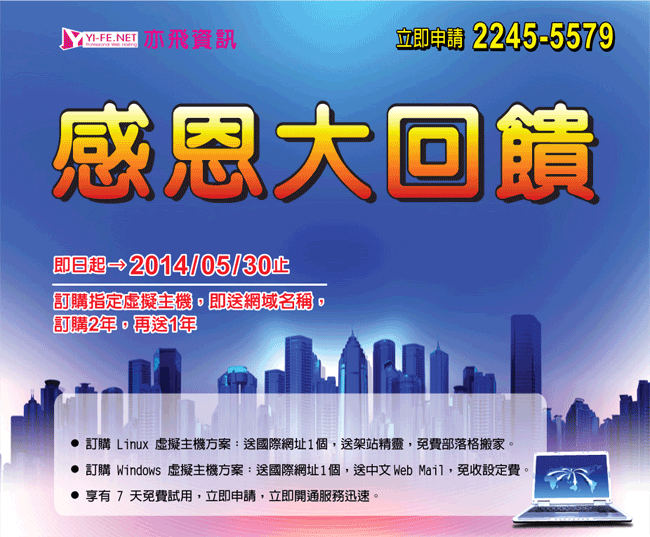 亦飞资讯全新第八代虚拟主机技术,所有网路设备、储存设备、网路线路,皆采用最高规格的双备援(N+1)架构,浏览访问您的网站更快更稳定!全面支持PHP5.3、ASP.NET4.0等等虚拟主机,免费拥有独立IP Address,350Mbps 无burst(瞬间颠峰频宽)限制,国外及大陆地区最近路由,全球皆可高速传输,软硬体/透明防火墙三重保障,SLL加密技术,保证数据安全,支援最高版本!